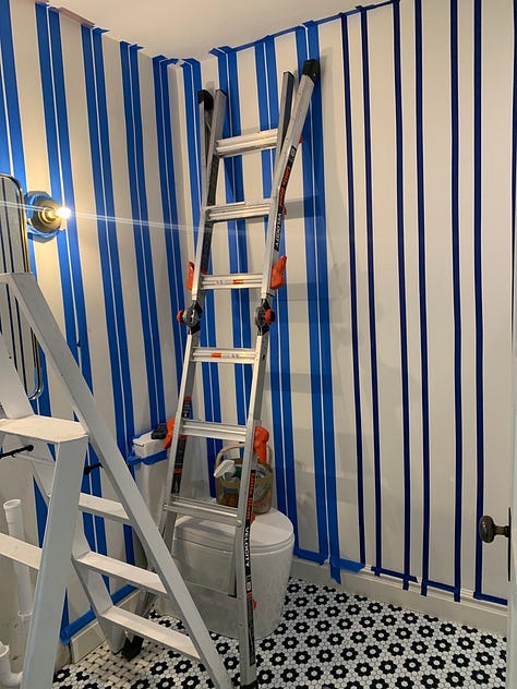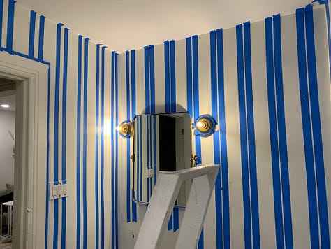 For the stripes, I taped for 4-inch white and blue stripes. My lines aren’t particularly crisp, but now I know that if you want perfectly straight lines, you should paint over all of the tape with your white paint first, and then apply the second color on top. this makes it so that none of your colored paint can slip beneath the tape. I’ve seen other hacks like using a damp sponge on the tape before painting or caulking the edge, but in my opinion painting is the fastest and easiest way of achieving a perfect line.