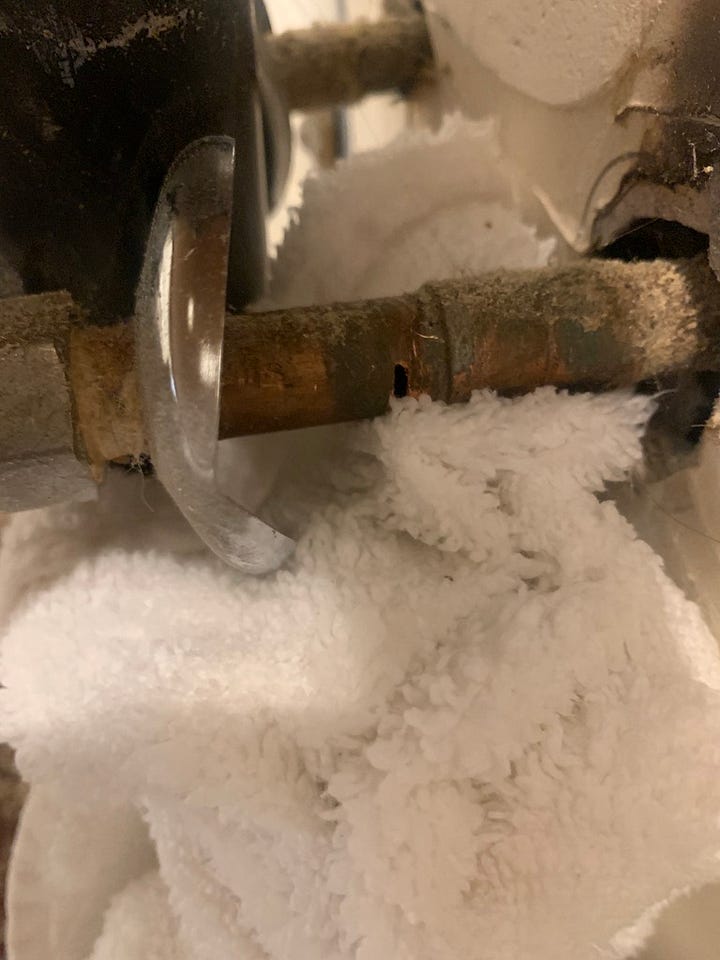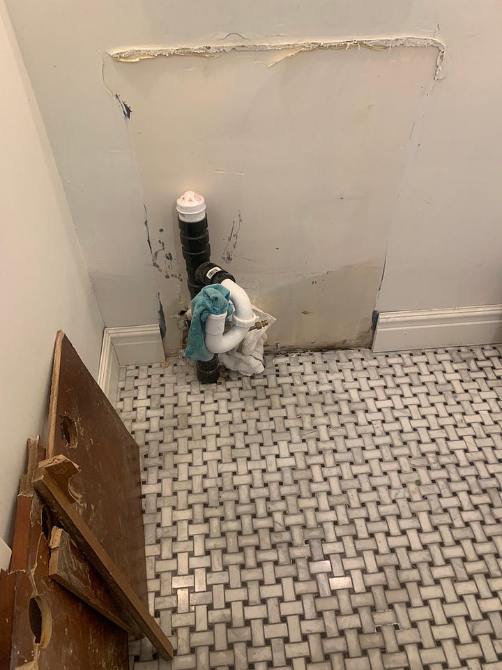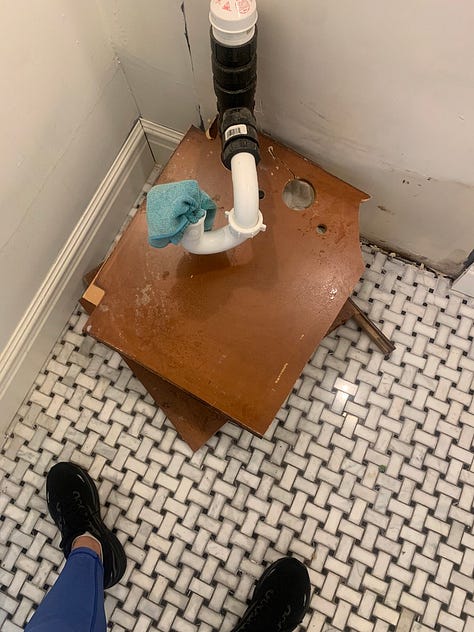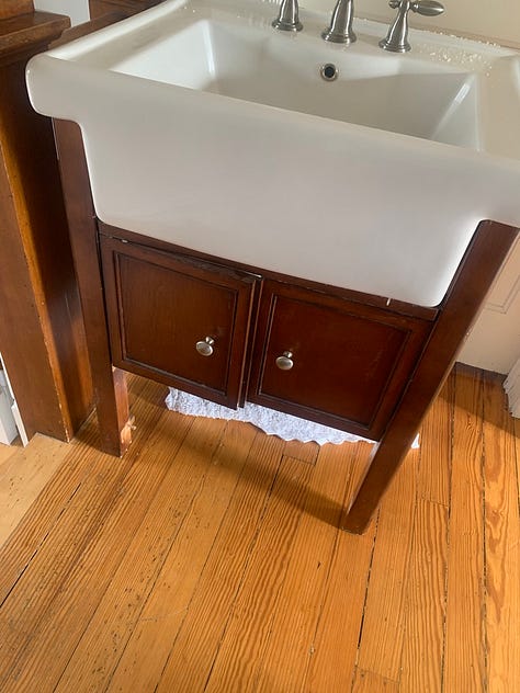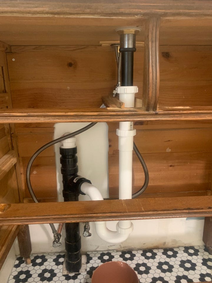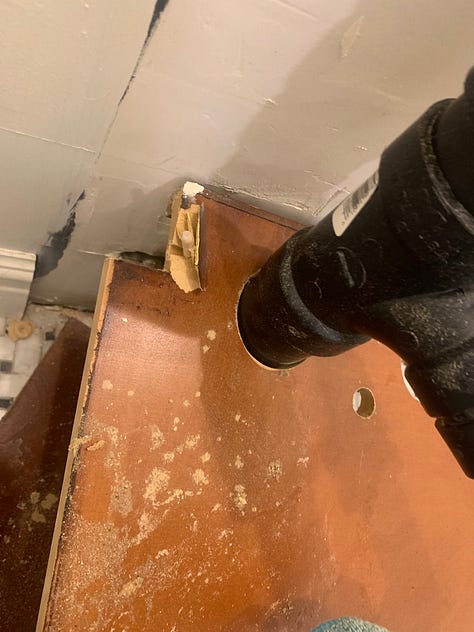 It took me a long time to decide to start this project, primarily because of two things I had no idea how to deal with. The first was the vanity. And before you ask me why on earth I’d remove it, this vanity is pure MDF (not wood) and had a Made in China sticker inside the door. It definitely was not original to the house. Whoever installed this, did so at the same time this drain line was put in, and they actually built the drain around the vanity. You can see in the images below that someone used a hole saw to cut through the bottom and shelf of the vanity and the threaded this pipe through. The pipe was fully glued together, so there was no unscrewing it for the sake of removal, and it’s such a tight fit! I had no idea how the heck I was going to get it off and ultimately, I hit the waterline with my hand saw as I was trying to remove it. Luckily we were quick at turning the water off and no real damage was done. It also meant we got new waterlines put in before I installed the new vanity, which was definitely a bonus.