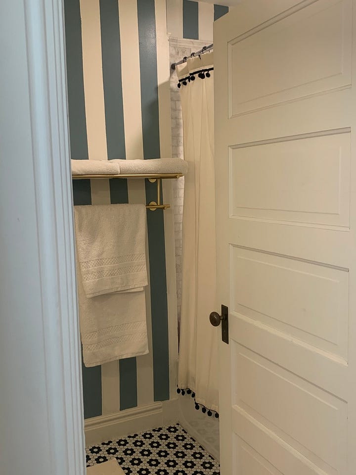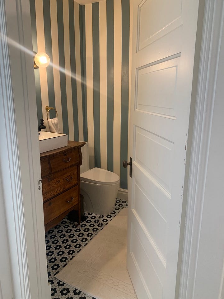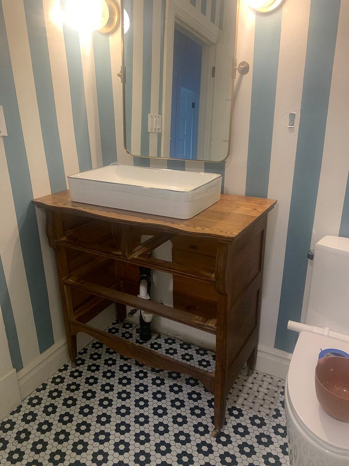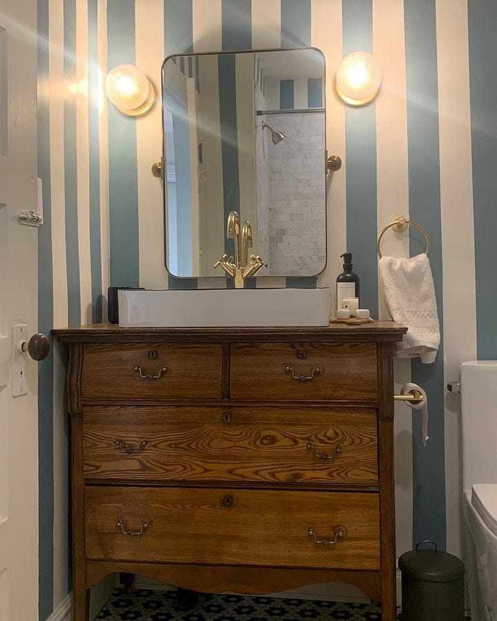 For now sprucing up this bathroom included painting wall stripes and replacing the vanity: