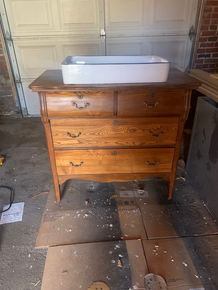 For the vanity, I purchased this dresser off Facebook Marketplace—it even came with a key for the drawers, which is great for baby proofing! I cut the drawers to work with my new plumbing and then reassembled everything in the bathroom.